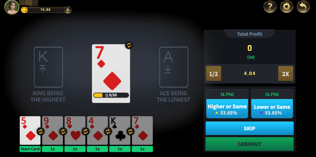 Test your luck and intuition in Royal x Casino's fast-paced Hilo game! The rules are simple yet exhilarating: