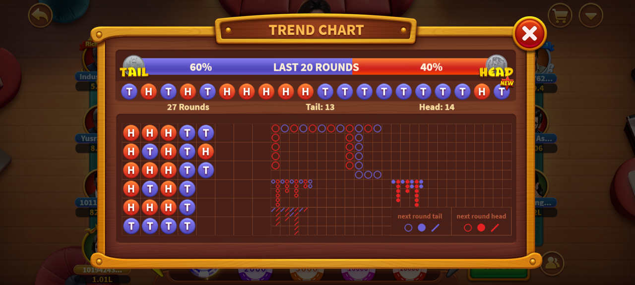 • 📊 منی ٹرینڈ چارٹ (آخری 13 راؤنڈ): ارغوانی = دم جیت / سرخ = سر کی جیت ([نیا] تازہ ترین نتائج کے لئے ٹیگز)